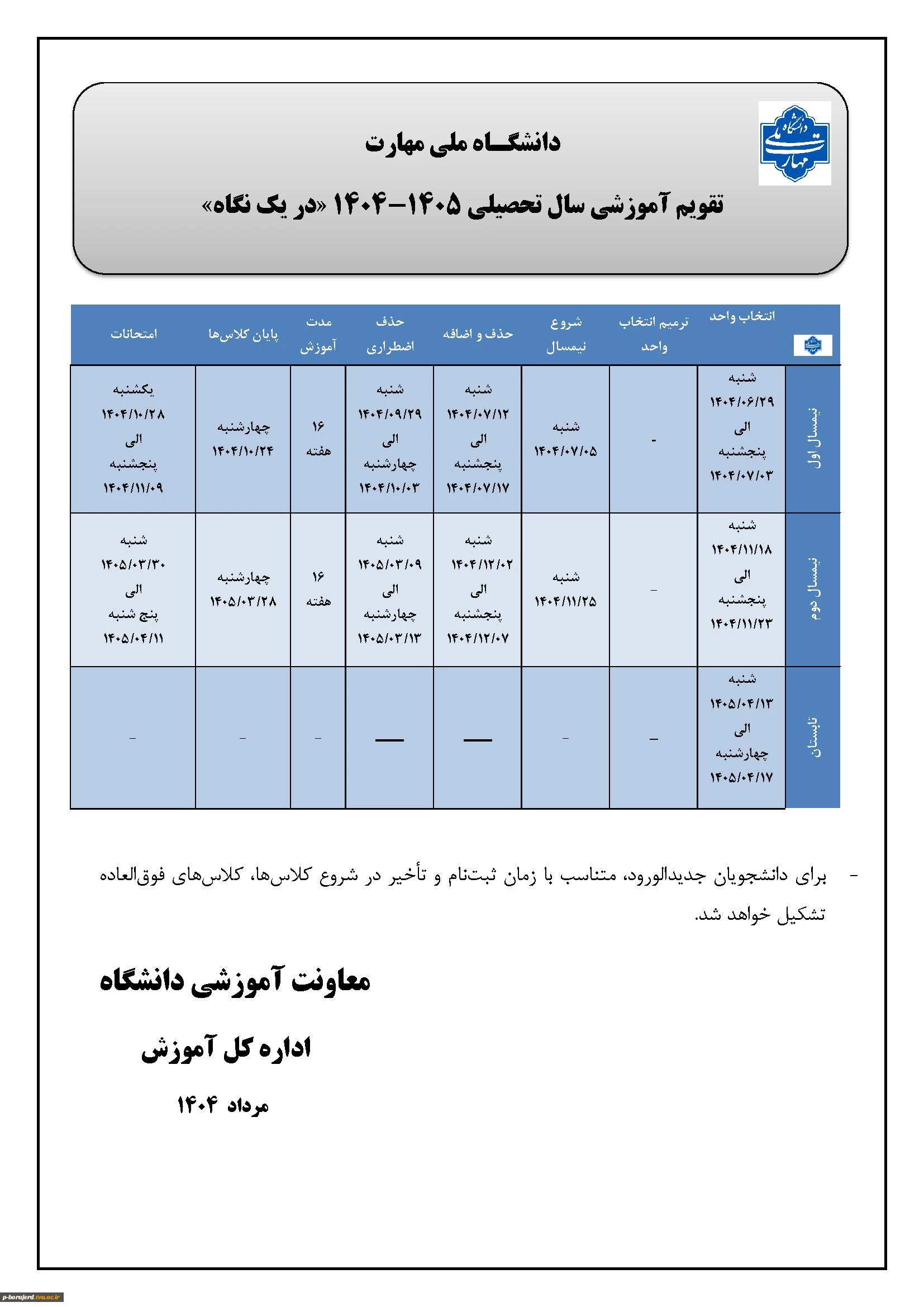 تقویم آموزشی سال تحصیلی 1405-1404 دانشگاه ملی مهارت 2
